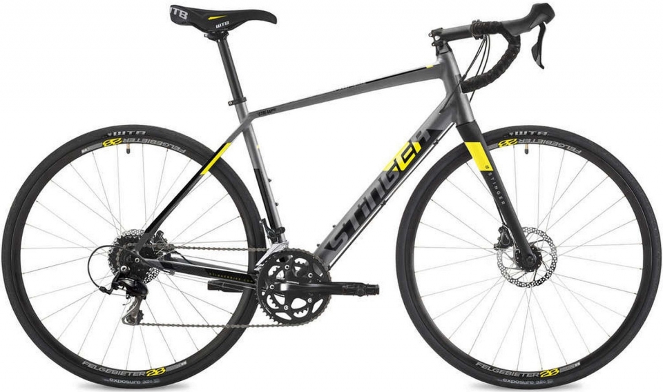 Флагман и новинка шоссейный велосипед от завода Stinger дебютировал в 2019 году и также без серьезных технических изменений представлена в 2020 рама слоппированная и ее геометрия приближена к комфортным шоссейным велосипедам, где основной приоритет это не спорт а фитнес, а также удобное дорожное транспортное средство. Основная техническая задача которая решалась это надежность и неприхотливость как рамы так и велосипеда, поэтому в раме применены технологии двойного батинга, конического рулевого стакана, и пространственных дропаутов с расположением тормоза на нижнем пере. На велосипеде использована карбоновая вилка с коническим рулевым стаканом для повышения комфорта за счет гашения вибрации углеволокном. Колеса одни из самых простых и надежных где нет экономии на весе и хорошая ремонтопригодность втулки на классическом конусном подшипнике Shimano WH-RX010. Отдельно стоит подчеркнуть покрышки шириной 32 мм, широкие по меркам шоссейных велосипедов ведь основной принцип это надежность при эксплуатации по Российским дорогам. Трансмиссия флагманского шоссейного велосипеда от Российского производителя реализована на группе Shimano Tiagra с десятискоростной кассетой и пистолетами с гидравлическими дисковыми тормозами максимум динамики при минимальных затратах на гоночные технологии.