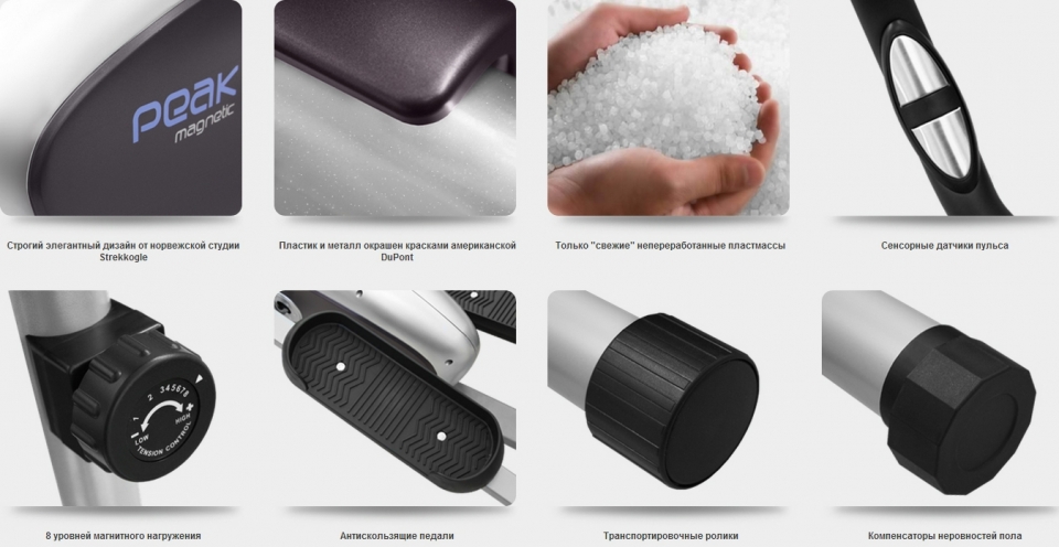 Oxygen Peak Е - удобный магнитный эллиптический тренажер базового уровня от немецкой компании Neotren GmbH. В основе системы нагружения - магнитный привод с увеличенным количеством магнитов, сбалансированный маховик весом с инерционным весом 13.2 кг., однокомпонентный педальный узел с реверсивным ходом, многожильный кевларовый ремень и преднатяжитель, а также внутренние высококачественные впрессованные подшипники. Такая комбинация позволяет добиться неплохого для этого класса оборудования качества хода и обеспечивает достаточную степень нагрузки для пользователей начального и среднего уровней подготовки. Легкочитаемый дисплей компьютера выводит на экран все основные параметры тренировки. Максимальный вес пользователя 110 кг.